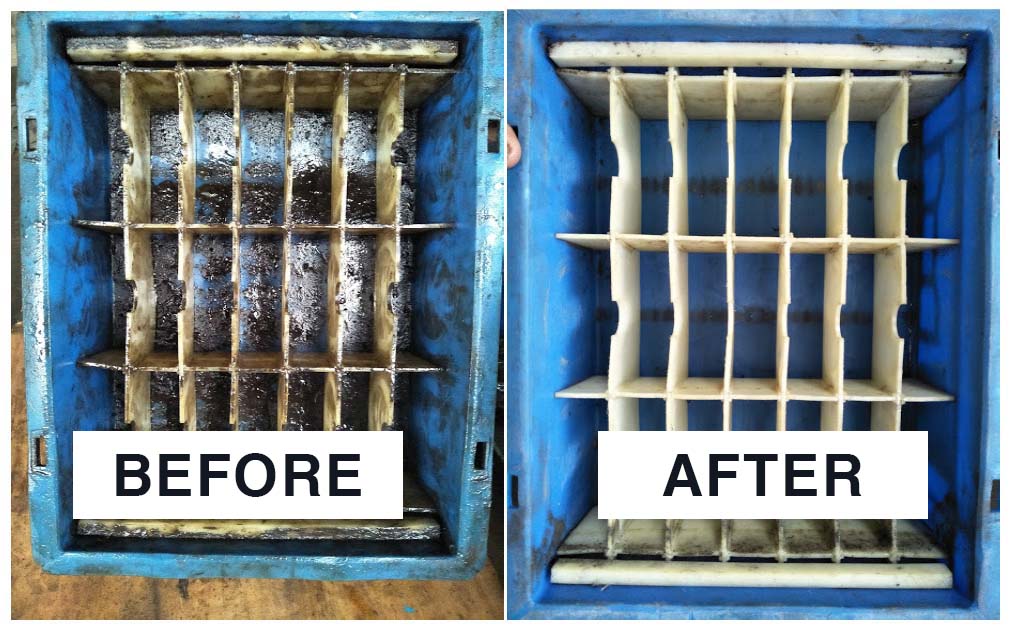 Product recommendation was very critical as the bin cleaning system utilized jet spray and hot water for cleaning. A typical solvent based cleaner with low flash point could cause a potential fire incident during the process. A water based cleaner with good wetting and soaking properties was vital.
